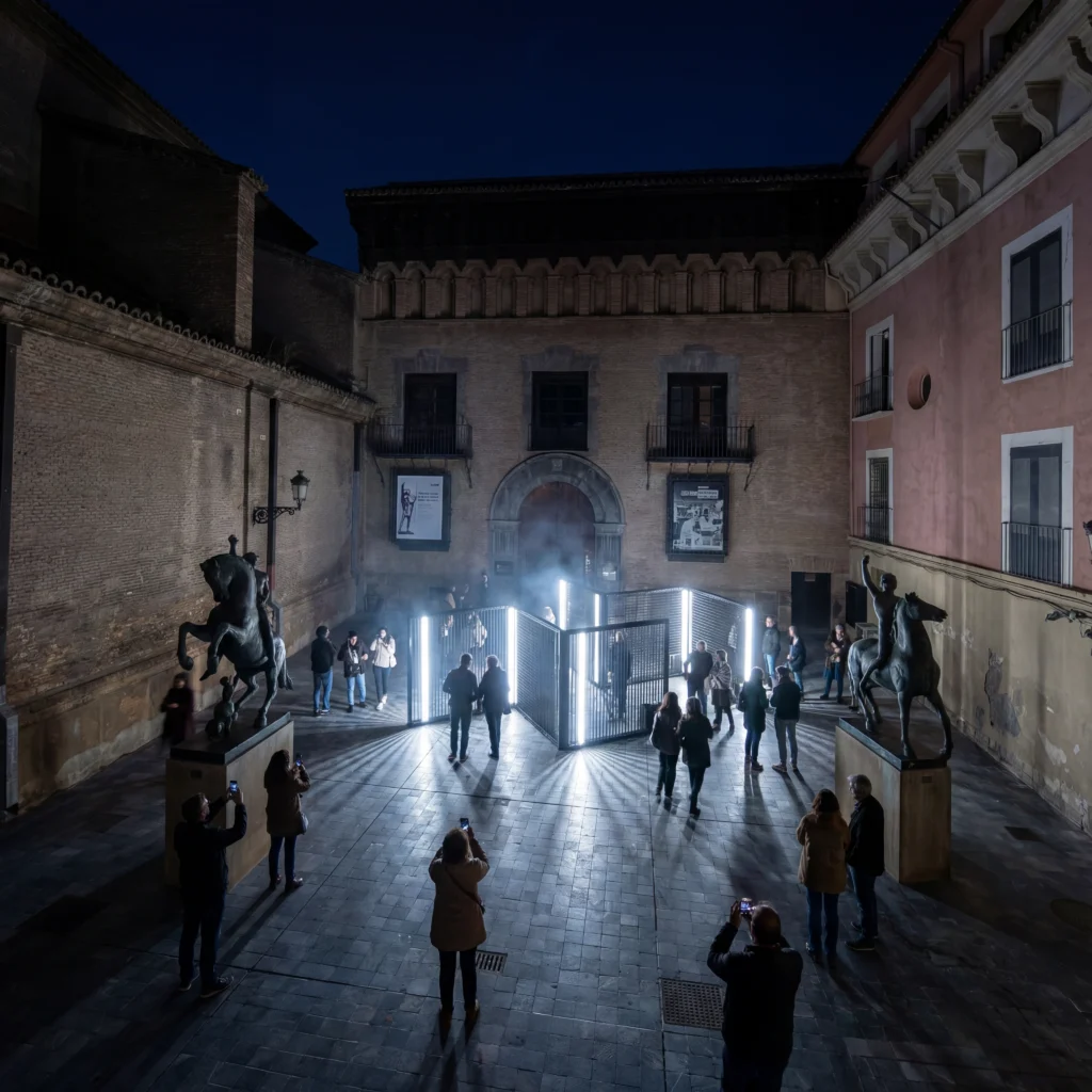 ‘Fiat Lux’, whose title means ‘let there be light’ in Latin, uses a combination of lasers, smoke and interactive elements to build a universe where light becomes a sensory language. In this work, the Roman Theatre of Zaragoza is transformed into an ephemeral setting for interaction between art and architecture. Arola opens up a constant dialogue between the absence and presence of light, creating dynamic subspaces that emerge, mutate and disappear, blurring the boundaries of what is tangible and intangible.